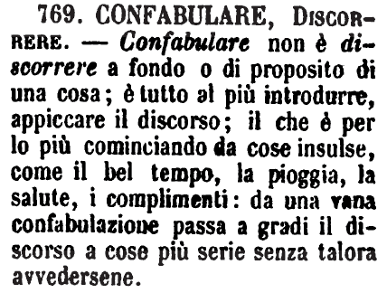| Confabulare, Discorrere - Confabulare non è discorrere a fondo o di proposito di una cosa; è tutto al più introdurre, appiccare il discorso; il che è per lo più cominciando da cose insulse, come il bel tempo, la pioggia, la salute, i complimenti: da una vana confabulazione passa a gradi il discorso a cose più serie senza talora avvedersene. [immagine] |