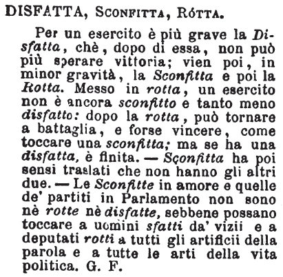 Disfatta, Sconfitta, Rotta - Per un esercito è più grave la Disfatta, chè, dopo di essa, non può più sperare vittoria; vien poi, in minor gravità, la Sconfitta e poi la Rotta. Messo in rotta, un esercito non è ancora sconfitto e tanto meno disfatto; dopo la rotta, può tornare a battaglia, e forse vincere, come toccare una sconfitta; ma se ha una disfatta, è finita. - Sconfitta ha poi sensi traslati che non hanno gli altri due. - Le Sconfitte in amore e quelle de' partiti in Parlamento non sono nè rottedisfatte, sebbene possano toccare a uomini sfatti da' vizii e a depotati rotti a tutti gli artificii della parola e a tutte le arti della vita politica. G. F. [immagine]