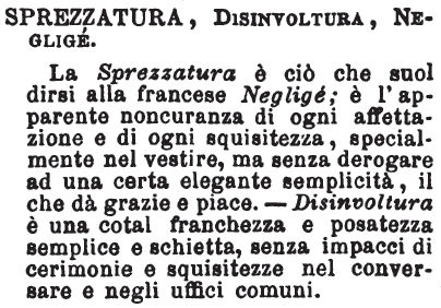 | Sprezzatura, Disinvoltura, Negligé - La Sprezzatura è ciò che suol dirsi alla francese Negligé; è l'apparente noncuranza di ogni affettazione e di ogni squisitezza, specialmente nel vestire, ma senza derogare ad una certa elegante semplicità, il che dà grazie e piace. - Disinvoltura è una cotal franchezza e posatezza semplice e schietta, senza impacci di cerimonie e squisitezze nel conversare e negli uffici comuni. [immagine] |