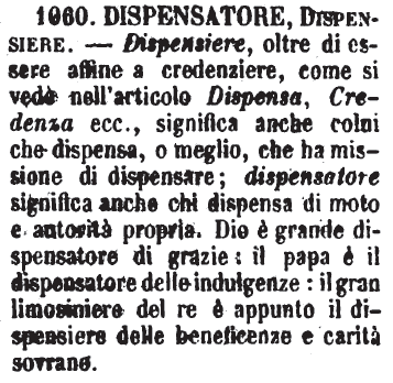| Dispensatore, Dispensiere - Dispensiere, oltre di essere affine a credenziere, come si vede nell'articolo Dispensa, Credenza ecc., significa anche colui che dispensa, o meglio, che ha missione di dispensare; dispensatore significa anche chi dispensa di moto e autorità propria. Dio è grande dispensatore di grazie: il papa è il dispensatore delle indulgenze: il gran limosiniere del re è appunto il dispensiere delle beneficenze e carità sovrane. [immagine] |