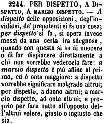 | Per dispetto, A dispetto, A marcio dispetto - A dispetto delle opposizioni, degl'invidiosi, de' prepotenti si fa una cosa; per dispetto si fa, si opera invece mossi da una certa ira sdegnosa, quando con questa si sa di nuocere o di far dispiacere direttamente a chi non vorrebbe vedercela fare: a marcio dispetto è più affine al primo, ed è onta maggiore: a dispetto vorrebbe significare malgrado altrui; per dispetto, a danno altrui; a marcio dispetto, ad onta altrui; e proprio per fare tutto all'opposto dell'altrui volere, giusto o ingiusto che sia. [immagine] |