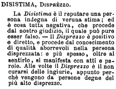 Disistima, Disprezzo - La Disistima è il reputare una persona indegna di veruna stima; ed è cosa tutta negativa, che procede dal nostro giudizio, il quale può pure esser falso. - Il Disprezzo è positivo e diretto, e procede dal conoscimento di qualità aborrevoli nella persona disprezzata: e più spesso, oltre al sentirlo, si manifesta con atti e parole. Alle volte il Disprezzo è il non curarsi delle ingiurie, appunto perchè vengono da persone degne del più alto disprezzo. [immagine]