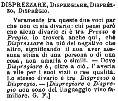 Disprezzare, Dispregiare, Disprezzo, Dispregio - Veramente tra queste due voci par che non ci sia divario: chi pensi però che alcun divario ci è tra Prezzo e Pregio, lo troverà anche qui, chè