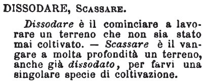 Dissodare, Scassare - Dissodare è il cominciare a lavorare un terreno che non sia stato mai coltivato. - Scassare è il vangare a molta profondità un terreno, anche già dissodato, per farvi una singolare specie di coltivazione. [immagine]