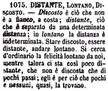 Distante, Lontano, Discosto - Discosto è ciò che non è a fianco, a costa; distante, ciò che è separato da una determinata distanza; in lontano la distanza è indeterminata. Stare discosto, essere distante, andare lontano. Si cerca d'ordinario la felicità lontano da noi, mentre talora ci sta così poco distante, che non è discosta che di pochi passi; egli è per ciò che pochi e nessuni, quasi, la trovano. [immagine]