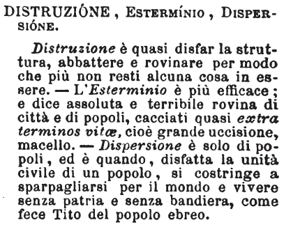 | Distruzione, Esterminio, Dispersione - Distruzione è quasi disfar la struttura, abbattere e rovinare per modo che più non resti alcuna cosa in essere. - L'Esterminio è più efficace; e dice assoluta e terribile rovina di città e di popoli, cacciati quasi extra terminos vitae, cioè grande uccisione, macello. - Dispersione è solo di popoli, ed è quando, disfatta la unità civile di un popolo, si costringe a sparpagliarsi per il mondo e vivere senza patria e senza bandiera, come fece Tito del popolo ebreo. [immagine] |