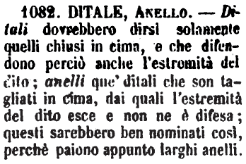 Ditale, Anello - Ditali dovrebbero dirsi solamente quelli chiusi in cima, e che difendono perciò anche l'estremità del dito; anelli que' ditali che son tagliati in cima, dai quali l'estremità del dito esce e non ne è difesa; questi sarebbero ben nominati così, perchè paiono appunto larghi anelli. [immagine]