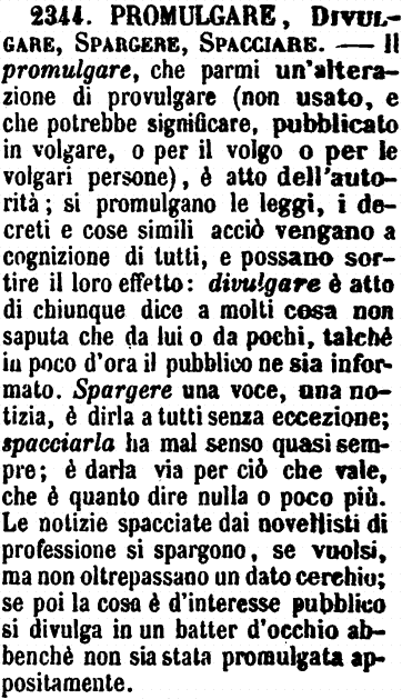 | Promulgare, Divulgare, Spargere, Spacciare - Il promulgare, che parmi un'alterazione di provulgare (non usato, e che potrebbe significare, pubblicato in volgare, o per il volgo o per le volgari persone), è atto dell'autorità; si promulgano le leggi, i decreti e cose simili acciò vengano a cognizione di tutti, e possano sortire il loro effetto: divulgare è atto di chiunque dice a molti cosa non saputa che da lui o da pochi, talchè in poco d'ora il pubblico ne sia informato. Spargere una voce, una notizia, è dirla a tutti senza eccezione; spacciarla ha mal senso quasi sempre; è darla via per ciò che vale, che è quanto dire nulla o poco più. Le notizie spacciate dai novellisti di professione si spargono, se vuolsi, ma non oltrepassano un dato cerchio; se poi la cosa è d'interesse pubblico si divulga in un batter d'occhio abbenchè non sia stata promulgata appositamente. [immagine] |