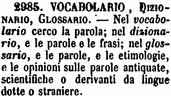 | Vocabolario, Dizionario, Glossario - Nel vocabolario cerco la parola; nel dizionario, e le parole e le frasi; nel glossario, e le parole, e le etimologie, e le opinioni sulle parole antiquate, scientifiche o derivanti da lingue dotte o straniere. [immagine] |
