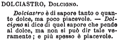 Dolciastro, Dolcigno - Dolciastro è il sapore tanto o quanto dolce, ma poco piacevole. - Dolcigno si dice di quel sapore che pende al doce, ma non si può dir tale veramente; e più spesso è piacevole. [immagine]