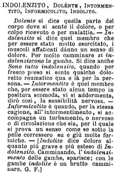 | Indolenzito, Dolente, Intormentito, Informicolito, Indolito - Dolente si dice quella parte del corpo dove si sente il dolore, o per colpo ricevuto o per malattia. - Indolenzito si dice quel membro che per essere stato molto esercitato, i muscoli affaticati dànno un senso di dolore. Per molto camminare si indolenziscono le gambe. Si dice anche Sono tutto indolenzito, quando per fresco preso si sente qualche doloretto reumatico qua e là per la persona. - Intormentito è quel membro che, per essere stato alcun tempo in positura scomoda, vi si addormenta, dirò così, la sensibilità nervosa. - Informicolito è quando, per la stessa cagione, all'intormentimento, si accompagna un turbamento, o nervoso o di circolazione che sia, per il quale si prova un senso come se sotto la pelle corressero su e giù molte formiche. - [Indolito dice dolore alquanto più grave e più esteso di Indolenzito. Camminando, l'indolenzimento delle gambe, sparisce; con le gambe indolite è un brutto camminare. G. F.] [immagine] |