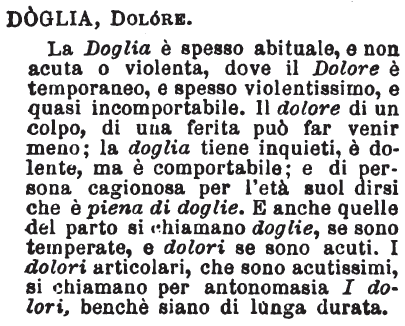 | Doglia, Dolore - La Doglia è spesso abituale, e non acuta o violenta, dove il Dolore è temporaneo, e spesso violentissimo, e quasi incomportabile. Il dolore di un colpo, di una ferita può far venir meno; la doglia tiene inquieti, è dolente, ma è comportabile; e di persona cagionosa per l'età suol dirsi che è piena di doglie. E anche quelle del parto si chiamano doglie, se sono temperate, e dolori se sono acuti. I dolori articolari, che sono acutissimi, si chiamano per antonomasia I dolori, benchè siano di lunga durata. [immagine] |