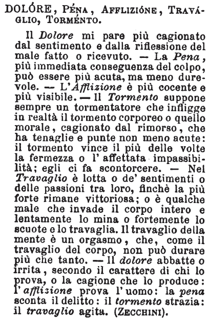 | Dolore, Pena, Afflizione, Travaglio, Tormento - Il dolore mi pare più cagionato dal sentimento e dalla riflessione del male fatto o ricevuto: la pena, più immediata conseguenza del colpo; può essere più acuta, ma meno durevole: l'afflizione è più cocente e più visibile. Il tormento suppone sempre un tormentatore che infligge in realtà il tormento corporeo, o quello morale cagionato dal rimorso, che ha tanaglie e punte non meno acute: il tormento vince il più delle volte la fermezza o l'affettata impassibilità; egli ci fa scontorcere. Nel travaglio è lotta o de' sentimenti o delle passioni tra loro, finchè la più forte rimane vittoriosa; o è qualche male che invade il corpo intero, e lentamente lo mina o fortemente lo scuote e lo travaglia. Il travaglio della mente è un orgasmo, che, come il travaglio del corpo, non può durare più che tanto. Il dolore abbatte o irrita, secondo il carattere di chi lo prova, o la cagione che lo produce: l'afflizione prova l'uomo; la pena sconta il delitto; il tormento strazia; il travaglio agita. [immagine] |