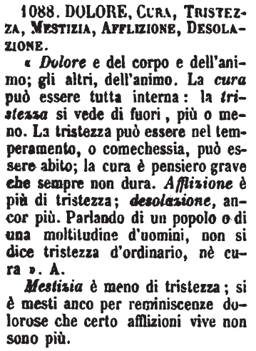 | Dolore, Cura, Tristezza, Mestizia, Afflizione, Desolazione - «Dolore e del corpo e dell'animo; gli altri, dell'animo. La cura può essere tutta interna: la tristezza si vede di fuori, più o meno. La tristezza può essere nel temperamento, o comechessia, può essere abito; la cura è pensiero grave che sempre non dura. Afflizione è più di tristezza; desolazione ancor più. Parlando di un popolo o di una moltitudine d'uomini, non si dice tristezza d'ordinario, nè cura». A.