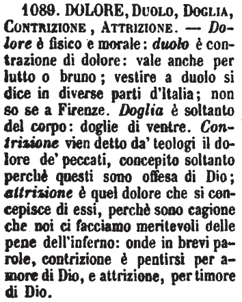 | Dolore, Duolo, Doglia, Contrizione, Attrizione - Dolore è fisico e morale: duolo è contrazione di dolore: vale anche per lutto o bruno; vestire a duolo si dice in diverse parti d'Italia; non so se a Firenze. Doglia è soltanto del corpo: doglie di ventre. Contrizione vien detto da' teologi il dolore de' peccati, concepito soltanto perchè questi sono offesa di Dio; attrizione è quel dolore che si concepisce di essi, perchè sono cagione che noi ci facciamo meritevoli delle pene dell'inferno: onde in brevi parole, contrizione è pentirsi per amore di Dio, e attrizione, per timore di Dio. [immagine] |