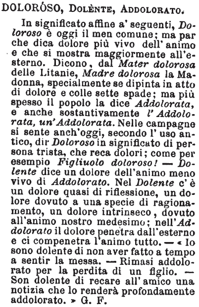 | Doloroso, Dolente, Addolorato - In significato affine a' seguenti, Doloroso è oggi il men comune; ma par che dica dolore più vivo dell'animo e che si mostra maggiormente all'esterno. Dicono, dal Mater dolorosa delle Litanie, Madre dolorosa la Madonna, specialmente se dipinta in atto di dolore e colle sette spade; ma più spesso il popolo la dice Addolorata, e anche sostantivamente l'Addolorata, un'Addolorata. Nelle campagne si sente anch'oggi, secondo l'uso antico, dir Doloroso in significato di persona trista, che reca dolori; come per esempio Figliuolo doloroso! - Dolente dice un dolore dell'animo meno vivo di Addolorato. Nel Dolente c'è un dolore quasi di riflessione, un dolore dovuto a una specie di ragionamento, un dolore intrinseco, dovuto all'animo nostro medesimo; nell'Addolorato il dolore penetra dall'esterno e ci compenetra l'animo tutto. - « Io sono dolente di non aver fatto a tempo a sentir la messa. - Rimasi addolorato per la perdita di un figlio. - Sono dolente di recare all'amico una notizia che lo renderà profondamente addolorato. » G. F. [immagine] |