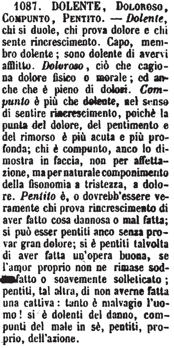 | Dolente, Doloroso, Computo, Pentito - Dolente, chi si duole, chi prova dolore e chi sente rincrescimento. Capo, membro dolente; sono dolente di avervi afflitto. Doloroso, ciò che cagiona dolore fisico o morale; ed anche che è pieno di dolori. Compunto è più che dolente, nel senso di sentire rincrescimento, poichè la punta del dolore, del pentimento e del rimorso è più acuta e più profonda; chi è compunto, anco lo dimostra in faccia, non per affettazione, ma per naturale componimento della fisonomia a tristezza, a dolore. Pentito è, o dovrebb'essere veramente chi prova rincrescimento di aver fatto cosa dannosa o mal fatta; si può esser pentiti anco senza provar gran dolore; si è pentiti talvolta di aver fatta un'opera buona, se l'amor proprio non ne rimase soddisfatto o soavemente solleticato; pentiti, tal altra, di non averne fatta una cattiva: tanto è malvagio l'uomo! si è dolenti del danno, compunti del male in sè, pentiti, proprio, dell'azione. [immagine] |