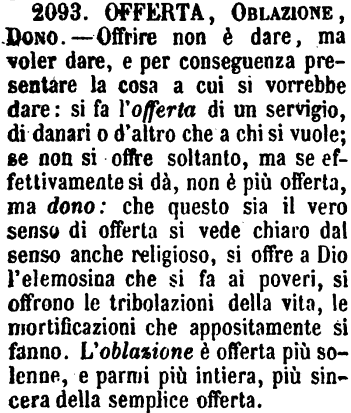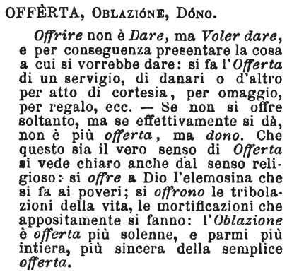 Offerta, Oblazione, Dono - Offrire non è Dare, ma Voler dare, e per conseguenza presentare la cosa a cui si vorrebbe dare: si fa l'Offerta di un servigio, di danari o d'altro per atto di cortesia, per omaggio, per regalo, ecc. - Se non si offre soltanto, ma se effettivamente si dà, non è più offerta, ma dono. Che questo sia il vero senso di Offerta si vede chiaro anche dal senso religioso: si offre a Dio l'elemosina che si fa ai poveri; si offrono le tribolazioni della vita, le mortificazioni che appositamente si fanno: l'Oblazione è offerta più solenne, e parmi più intiera, più sincera della semplice offerta. [immagine]