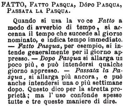 Fatto, Fatto Pasqua, Dopo Pasqua, Passata la Pasqua - Quando si usa la voce Fatto a modo di avverbio di tempo, si accenna il tempo che succede al giorno nominato, e indica tempo immediato. - Fatto Pasqua, per esempio, si intende generalmente per il giorno appresso. - Dopo Pasqua si allarga un poco più, e può intendersi qualche giorno appresso. - Passata la Pasqua, si allarga più ancora, e può anche intendersi una o più settimane dopo. Questo dico per la stretta proprietà; ma l'uso confonde spesso tutte e tre queste maniere di dire. [immagine]
