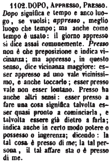 Dopo, Appresso, Presso - Dopo significa e tempo e anco luogo, se vuolsi; appresso, meglio luogo che tempo; ma anche come tempo è usato: il giorno appresso si dice assai comunemente. Presso non è che preposizione e indica vicinanza; ma appresso, in questo senso, dice vicinanza maggiore: esser appresso ad uno vale vicinissimo, e anche toccarlo; esser presso vale non esser lontano. Presso ha anche altri sensi: esser presso a fare una cosa significa talvolta esser quasi pronto a cominciarla, e talvolta essere già dietro a farla; indica anche in certo modo potere o possesso o ingerenza; dicendo: la tal cosa è presso di me; la tal persona, il tal affare sta o è presso di me. [immagine]