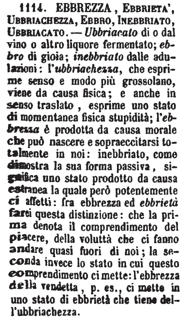 Ebbrezza, Ebbrietà, Ubbriachezza, Ebbro, Inebbriato, Ubbriacato - Ubbriacato di o dal vino o altro liquore fermentato; ebbro di gioia; inebbriato dalle adulazioni: l'ubbriachezza, che esprime senso e modo più grossolano, viene da causa fisica; e anche in senso traslato, esprime uno stato di momentanea fisica stupidità; l'ebbrezza è prodotta da causa morale che può nascere e sopraeccitarsi totalmente in noi: inebbriato, come dimostra la sua forma passiva, significa uno stato prodotto da causa estranea la quale però potentemente ci affetti: fra ebbrezza ed ebbrietà farei questa distinzione: che la prima denota il comprendimento del piacere, della voluttà che ci fanno andare quasi fuori di noi; la seconda invece lo stato in cui questo comprendimento ci mette: l'ebbrezza della vendetta, p. es., ci mette in uno stato di ebbrietà che tiene dell'ubbriachezza. [immagine]
