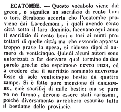 | Ecatombe - Questo vocabolo viene dal greco, e significa un sacrifizio di cento bovi o tori. Strabone accerta che l'ecatombe proviene dai Lacedemoni, i quali avendo cento città sotto il loro dominio, facevano ogni anno il sacrifizio di cento bovi o tori ai numi protettori di quelle città; ma che essendo apparsa troppo grave la spesa, si ridusse dipoi al numero di venticinque. Quindi alcuni autori sono autorizzati a far derivare quel termine da due parole greche che esprimono cento piedi, ed a credere che il sacrifizio nominato ecatombe fosse di sole venticinque bestie da quattro zampe. Si è fatto pure menzione di chiliombe, cioè sacrifizj di mille bestie; ma se pure ve ne furono, devono essere stati rarissimi, poichè diversamente avrebbero esaurito tutto il bestiame delle provincie. [immagine] |
