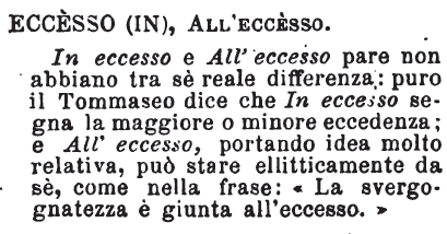 Eccesso (in), All’eccesso - In eccesso e All'eccesso pare non abbiano tra sè reale differenza: puro il Tommaseo dice che In eccesso segna la maggiore o minore eccedenza; e All'eccesso, portando idea molto relativa, può stare ellitticamente da sè, come nella frase: «La svergognatezza è giunta all'eccesso.» [immagine]