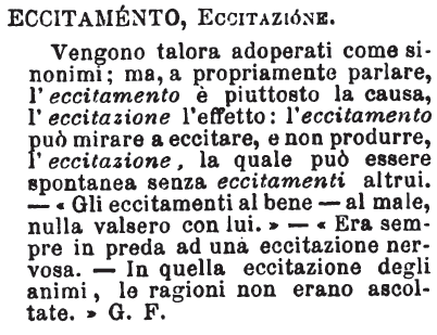Eccitamento, Eccitazione - Vengono talora adoperati come sinonimi; ma, a propriamente parlare, l'eccitamento è piuttosto la causa, l'eccitazione l'effetto: l'eccitamento può mirare a eccitare, e non produrre, l'eccitazione, la quale può essere spontanea senza eccitamenti altrui. - «Gli eccitamenti al bene - al male, nulla valsero con lui.» - «Era sempre in preda ad una eccitazione nervosa. - In quella eccitazione degli animi, le ragioni non erano ascoltate.» G. F. [immagine]