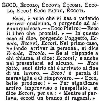 Ecco, Eccolo, Eccovi, Eccomi, Ecco! Ecco fatto, Eccoti - Ecco, è voce che si usa o vedendo arrivar qualcuno, o porgendo ad alcuno qualcosa. - « Ecco Pietro; - Ecco il libro che promisi. » - In questo caso si dice, porgendo l'oggetto, Eccolo, Eccovi, Eccoti. Nel primo caso, vedendo arrivar la persona, si dice Eccola, Eccolo. - Se si risponde a chi chiama, si dice: Eccomi; e anche nel presentarsi ad alcuno. - Ecco fatto, suol dirlo chi è arrivato al fine di un lavoro. - Ecco! è parola di maraviglia e di rimprovero. - « Ecco, belle prodezze! » - Per significare arrivo improvviso o inaspettato, si dice Eccoti, per es.: « Mentre si parlava, eccoti un branco di ragazzi. » [immagine]