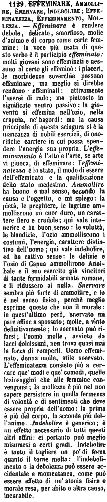 Effeminare, Ammollire, Snervare, Indebolire; Effeminatezza, Effeminamento, Mollezza - Effeminare è rendere debole, delicato, smorfioso, molle d'animo e di corpo come certe femmine: la voce più usata di questo verbo è il participio effeminato: molti giovani sono effeminati e nessuno al certo gli effeminò: i piaceri, le morbidezze soverchie possono effeminare, ma meglio si direbbe rendono effeminati: attivamente l'userei di rado; ma piuttosto in significato neutro passivo: la gioventù si effemina nell'ozio, nella crapula, ne' bagordi: ma la causa principale di questa sciagura si è la mancanza di nobili esercizii, di onorifiche carriere in cui possa spendere l'energia sua propria. L'effeminamento è l'atto e l'arte, se arte vi giuoca, di effeminare: l'effeminatezza è lo stato, il modo di essere dell'effeminato e la qualificazione dello stato medesimo. Ammollire ha buono e mal senso, secondo la causa e l'oggetto, e mi spiego: la pietà, le preghiere, le lagrime ammolliscono un cuor duro, un carattere fiero e crudele; qui vale intenerire e ha buon senso: le voluttà le blandizie, l'ozio ammolliscono i costumi, l'energia, carattere distintivo dell'uomo; qui vale indebolire, ed ha cattivo senso: le delizie e l'ozio di Capua ammollirono Annibale e il suo esercito già vincitori di tante formidabili armate romane, e li ridussero al nulla. Snervare sembra più forte di ammollire, e lo è nel senso fisico, perchè meglio esprime questo che non il morale: in quest'ultimo però, snervato mi pare affine a spossato; molle, a vinto definitivamente; lo snervato può rifarsi; l'uomo molle, avvinto da lacci dolcissimi, non trova quasi mai la forza di romperli. Uomo effeminato, donna molle, stile snervato. L'effeminatezza consiste più a cercare que' modi e que' comodi, quelle leziosaggini che alle femmine convengonsi; la mollezza è più nel non sapere persistere in quella fermezza di volontà e di sentimenti che deve essere propria dell'uomo: la prima è più del corpo, la seconda più dell'animo. Indebolire è generico; è un effetto necessario di tutti questi altri affini: ei pertanto può meglio misurarsi a certi gradi. Indebolire è tanto il togliere un po' di forza quanto il torne molta: l'indebolimento o la debolezza può essere accidentale e momentanea, come può essere effetto di un'atonia fisica e morale resa, per abito o altra causa, incurabile. [immagine]