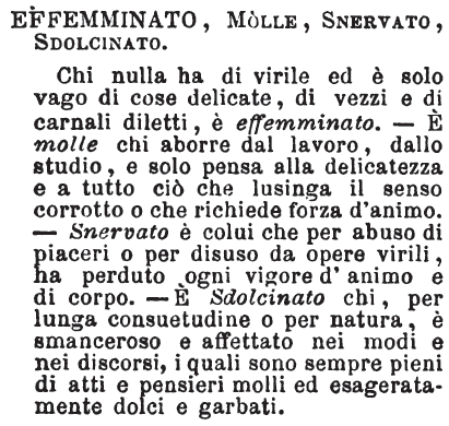 | Effeminato, Molle, Snervato, Sdolcinato - Chi nulla ha di virile ed è solo vago di cose delicate, di vezzi e di carnali diletti, è effemminato. - È molle chi aborre dal lavoro, dallo studio, e solo pensa alla delicatezza e a tutto ciò che lusinga il senso corrotto o che richiede forza d'animo. - Snervato è colui che per abuso di piaceri o per disuso da opere virili, ha perduto ogni vigore d'animo e di corpo. - È Sdolcinato chi, per lunga consuetudine o per natura, è smanceroso e affettato nei modi e nei discorsi, i quali sono sempre pieni di atti e pensieri molli ed esageratamente dolci e garbati. [immagine] |