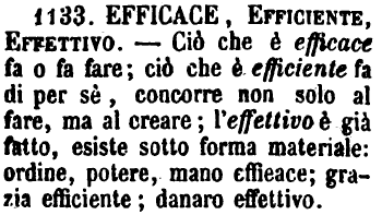 | Efficace, Efficiente, Effettivo - Ciò che è efficace fa o fa fare; ciò che è efficiente fa di per sè, concorre non solo al fare, ma al creare; l'effettivo è già fatto, esiste sotto forma materiale: ordine, potere, mano efficace; grazia efficiente; danaro effettivo. [immagine] |