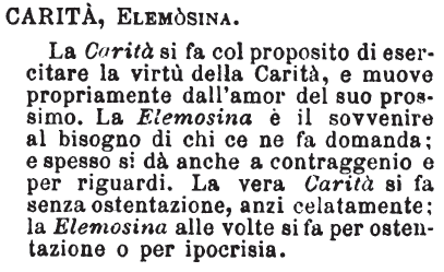 | Carità, Elemosina - L'elemosina è più minuta, perciò si può fare più di sovente; la carità è atto più essenziale, più generoso, più nobile; molti fanno elemosina, pochi sanno fare la carità: l'elemosina consiste sempre in danaro o roba; la carità può farsi talora con un buon consiglio, una buona parola, una raccomandazione e simili. [immagine] |