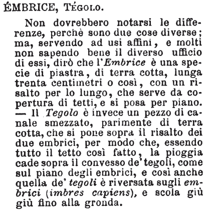 Embrice, Tegolo, Coppo, Doccio - «Embrice, dice la Crusca, tegola piana, della lunghezza di due terzi di braccio, con un risalto per lo lungo da ogni lato: serve per copertura dei tetti, e si volta col risalto all'insù; sopra il quale si pongono tegole o tegolini, acciocchè non vi trapeli l'acqua tra l'uno e l'altro. Il tegolo è un pezzo di terra cotta più lungo che largo, convesso, e, d'ordinario, dall'un capo stretto più che dall'altro». Tommaseo.