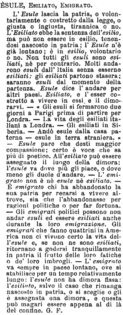 | Esule, Esiliato, Emigrato - L'Esule lascia la patria, o volontariamente o costretto dalla legge, o giusta o ingiusta, tirannica o no. L'Esiliato ebbe la sentenza dell'esilio, ma può non essere in esilio, tenendosi nascosto in patria; l'Esule n'è già lontano; è in esilio, volontario o no. Non tutti gli esuli sono esiliati, né per contrario. Molti andarono esuli dall'Italia senza esserne esiliati: gli esiliati partono stasera; saranno esuli dal momento della partenza. Esule dice l'andare per altri paesi. Esiliato, e l'esser costretto a vivere in essi e il dimorarvi. - «Gli esuli si fermarono due giorni a Parigi prima di partire per Londra. - La vita degli esiliati Italiani a Londra. - Gli esiliati in Siberia. - Andò esule dalla casa paterna - esule in terra straniera.» - Esule pare che desti maggior compassione; certo è voce che sa più di poetico. All'esiliato può essere assegnato il luogo della dimora; l'esule va dove più gli piace, o dove meno gli duole d'andare. - L'emigrato non è nè esule nè esiliato. - E' emigrato chi ha abbandonato la sua patria per recarsi a vivere altrove, sia che l'abbandonasse per ragioni politiche o per far fortuna. - Gli emigrati politici possono non andar esuli ed essere esiliati anche durante la loro emigrazione. Gli emigrati che fanno quattrini in America non ci vivono certo la vita dell'esule e, se non ne sono esiliati, ritornano a godersi tranquillamente in patria il frutto delle loro fatiche o de' loro imbrogli. - L'emigrato va sempre in paese lontano, ove si stabilisce per un tempo relativamente lungo: l'esule non ha dimora fissa: l'esiliato, salvo il caso che rimanga nascosto in patria, o si sceglie o gli è assegnata una dimora, e questa può magari essere appena al di là del confine. G. F. [immagine] |