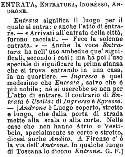 | Entrata, Entratura, Ingresso, Androne - Entrata significa il luogo per il quale si entra: e anche l'atto di entrare. - «Arrivati all'entrata della città, furono cacciati. - Fece la solenne entrata.» - Anche la voce Entratura ha nell'uso ambedue que' significati, secondo i casi; ma ha poi l'uso speciale di significare la prima stanza che si trova entrando in una casa, in un quartiere. - Ingresso è quel medesimo che Entrata, salvo che è più nobile; nè si userebbe se non per L'atto di entrare. Il contrario di Entrata è Uscita; di Ingresso è Egresso. - [Androne è Luogo coperto, stretto e lungo, che dalla porta di strada mette alla scala o alla corte. Nelle case che non hanno Atrio o Vestibolo, specialmente se corto e stretto, dicesi anche Andito. A Firenze c'è la via dell'Androne. In qualche luogo di Toscana lo dicono Entrone. G.F.] [immagine] |