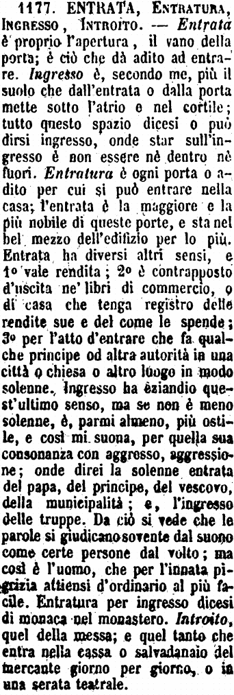 | Entrata, Entratura, Ingresso, Introito - Entrata è proprio l'apertura, il vano della porta; è ciò che dà adito ad entrare. Ingresso è, secondo me, più il suolo che dall'entrata o dalla porta mette sotto l'atrio e nel cortile; tutto questo spazio dicesi o può dirsi ingresso, onde star sull'ingresso è non essere nè dentro nè fuori. Entratura è ogni porta o adito per cui si può entrare nella casa; l'entrata è la maggiore e la più nobile di queste porte, e sta nel bel mezzo dell'edifizio per lo più. Entrata ha diversi altri sensi, e 1° vale rendita; 2° è contrapposto d'uscita ne' libri di commercio, o di casa che tenga registro delle rendite sue e del come le spende; 3° per l'atto d'entrare che fa qualche principe od altra autorità in una città o chiesa o altro luogo in modo solenne. Ingresso ha eziandio quest'ultimo senso, ma se non è meno solenne, è, parmi almeno, più ostile, e così mi suona, per quella sua consonanza con aggresso, aggressione; onde direi la solenne entrata del papa, del principe, del vescovo, della municipalità; e, l'ingresso delle truppe. Da ciò si vede che le parole si giudicano sovente dal suono come certe persone dal volto; ma così è l'uomo, che per l'innata pigrizia attiensi d'ordinario al più facile. Entratura per ingresso dicesi di monaca nel monastero. Introito, quel della messa; e quel tanto che entra nella cassa o salvadanaio del mercante giorno per giorno, o in una serata teatrale. [immagine] |