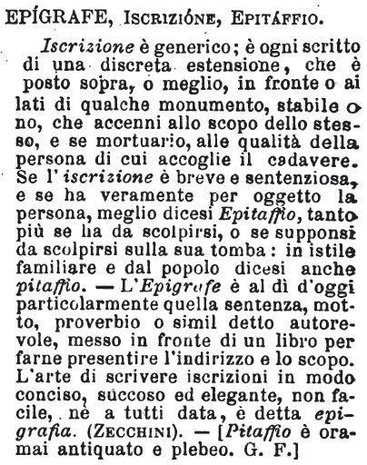 Epigrafe, Iscrizione, Epitaffio - Iscrizione è generico; è ogni scritto di una discreta estensione, che è posto sopra, o meglio, in fronte o ai lati di qualche monumento, stabile o no, che accenni allo scopo dello stesso, e se mortuario, alle qualità della persona di cui accoglie il cadavere. Se l'iscrizione è breve e sentenziosa, e se ha veramente per oggetto la persona, meglio dicesi Epitaffio, tanto più se ha da scolpirsi, o se supponsi da scolpirsi sulla sua tomba: in istile familiare e dal popolo dicesi anche pitaffio. - L'Epigrafe è al dì d'oggi particolarmente quella sentenza, motto, proverbio o simil detto autorevole, messo in fronte di un libro per farne presentire l'indirizzo e lo scopo. L'arte di scrivere iscrizioni in modo conciso, succoso ed elegante, non facile, nè a tutti data, è detta epigrafia. (Zecchini). - [Pitaffio è oramai antiquato e plebeo. G. F.] [immagine]