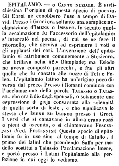 | Epitalamio - o Canto nuziale. È antichissima l’origine di questa specie di poesia. Gli Ebrei ne conobbero l’uso a tempo di David. Presso i Greci era soltanto una semplice acclamazione d’Imene o Imeneo. In seguito quella acclamazione fu l’accessorio dell’epitalamio: s’intercalò nel poema, di cui se ne fece il ritornello, che serviva ad esprimere i voti e gli applausi dei cori. L’invenzione dell’epitalamio si attribuisce comunemente a Stesicoro, che brillava nella 42.ª Olimpiade; ma Esiodo ne aveva composto parecchi, e fra gli altri quello che fu cantato alle nozze di Teti e Peleo. L’epitalamio latino ha un’origine poco diversa dal greco. Presso i Romani cominciò con l’acclamazione della parola Talassio o Talasso, che era il dio degli sponsali, o solamente una espressione di gioja consacrata alla solennità di quella sorta di feste, e che significava lo stesso che Imene ed Imeneo presso i Greci. I versi che si cantavano in allora erano rozzi e pieni di oscenità, e si chiamavano Fescennini (Ved. Fescennini) Questa specie di epitalamio fu in uso sino al tempo di Catullo, il primo dei latini che prendendo Saffo per modello sostituì a Talassio l’acclamazione Imene, e portò presso i Latini l’epitalamio alla perfezione in cui oggi lo vediamo. [immagine] |