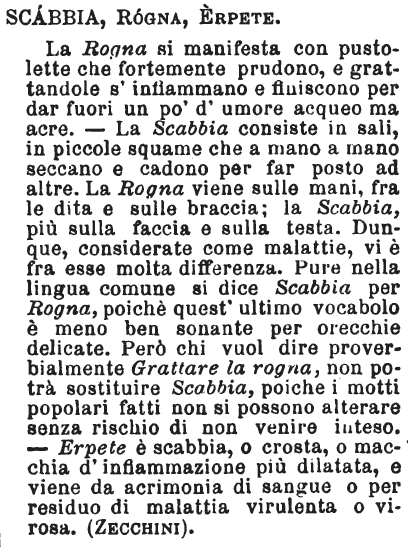 Scabbia, Rogna, Erpete - La rogna si manifesta con pustulette che fortemente prudono, e grattandole s'infiammano e finiscono per dare fuori un po' d'umore acqueo ma acre; la scabbia consiste in sali, in piccole squame che a mano a mano seccano e cadono per fare posto ad altre: la rogna viene sulle mani, fra le dita e sulla faccia; la scabbia, più sulla faccia, sulla testa. Dunque, considerate come malattie, vi è fra esse molta differenza; pure nella lingua comune si dice scabbia per rogna, poichè quest'ultimo vocabolo è meno ben suonante per orecchie delicate: però chi vuole dire proverbialmente grattare la rogna non potrà sostituire scabbia, poichè i motti popolari fatti non si puonno alterare senza rischio di non venire inteso. Erpete è scabbia, o crosta, o macchia d'infiammazione più dilatata, e viene da acrimonia di sangue o per residuo di malattia virulenta o virosa. [immagine]