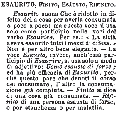 | Esaurito, Finito, Esausto, Rifinito - Esaurito suona Che è ridotto in difetto della cosa per averla consumata a poco a poco; ma questa voce si usa solo come participio nelle voci del verbo Esaurire. Per es.: «La città aveva esaurito tutti i mezzi di difesa.» Non è per altro bene elegante. - La voce Esausto, invèce, anch'essa participio di Esaurire, si usa solo a modo di adjettivo: Uomo esausto di forze; ed ha più efficacia di Esaurito, perchè questo pare che denoti il corso del consumare, l'altro la consumazione già compiuta. - Finito si dice di una cosa già consumata. - Rifinito di una persona esausta di forze, o per stanchezza o per malattia. [immagine] |
