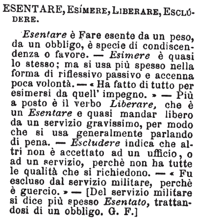 | Esentare, Esimere, Liberare, Escludere - Esentare è Fare esente da un peso, da un obbligo, è specie di condiscendenza o favore. - Esimere è quasi lo stesso; ma si usa più spesso nella forma di riflessivo passivo e accenna poca volontà. - «Ha fatto di tutto per esimersi da quell'impegno.» - Più a posto è il verbo Liberare, che è un Esentare e quasi mandar libero da un servizio gravissimo, per modo che si usa generalmente parlando di pena. - Escludere indica che altri non è accettato ad un ufficio, o ad un servizio, perchè non ha tutte le qualità che si richiedono. - «Fu escluso dal servizio militare, perchè è guercio.» - [Del servizio militare si dice più spesso Esentato, trattandosi di un obbligo. G.F.] [immagine] |