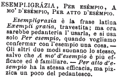 | Esempligrazia, Per esempio, A mo’ d’esempio, Per atto d’esempio - Esempligrazia è la frase latina Exempli gratia, travestita; ma ora sarebbe pedanteria l'usarla, e si usa solo Per esempio, quando vogliamo confermar con l'esempio una cosa. - Gli altri due modi suonano lo stesso, salvo che A mo' d'esempio è più efficace ed è familiare. - Per atto d'esempio ha la stessa efficacia, ma pizzica un poco del pedantesco. [immagine] |
