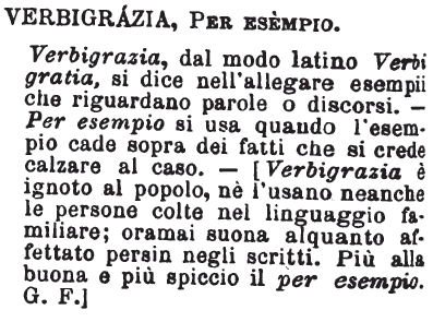 | Verbigrazia, Per esempio - Verbigrazia, dal modo latino Verbi gratia, si dice nell'allegare esempii che riguardano parole o discorsi. - Per esempio si usa quando l'esempio cade sopra dei fatti che si crede calzare al caso. - [Verbigrazia è ignoto al popolo, nè l'usano neanche le persone colte nel linguaggio familiare; oramai suona alquanto affettato persin negli scritti. Più alla buona e più spiccio il per esempio. G. F.] [immagine] |