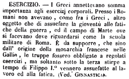 | Esercizio - I Greci annettevano somma importanza agli esercizj corporali. Presso i Romani non avevano, come fra i Greci, altro oggetto che di assuefare la gioventù alle fatiche della guerra, ed il campo di Marte ove si facevano deve riguardarsi come la scuola militare di Roma. E' da supporre, che sino dall'origine della monarchia francese nelle Gallie, le truppe fossero obbligate a regolati esercizi, ma soltanto sotto la terza stirpe a tempo di Filippo I.° vennero assuefatte al lavoro ed alla fatica. (Ved. Ginnastica). [immagine] |