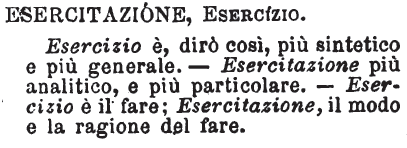 | Esercitazione, Esercizio - «Esercitazione è esercizio più deliberato, e più ordinariamente diretto a uno scopo. Non ogni esercizio è dunque esercitazione. Così talvolta si chiama anche l'opera ch'è frutto dell'esercizio; quindi le esercitazioni rettoriche; quindi con questo titolo modesto notai parecchi libri assai gravi». A. [immagine] |