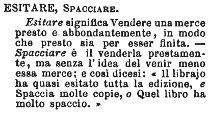 Esitare, Spacciare - Esitare significa Vendere una merce presto e abbondantemente, in modo che presto sia per esser finita. - Spacciare è il venderla prestamente, ma senza l'idea del venir meno essa merce; e così dicesi: «Il librajo ha quasi esitato tutta la edizione, e Spaccia molte copie, o Quel libro ha molto spaccio.» [immagine]