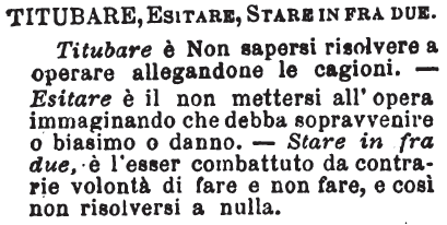 Titubare, Esitare, Stare in fra due - Titubare è non sapersi risolvere a operare allegandone le cagioni. - Esitare è il non mettersi all'opera immaginando che debba sopravvenire o biasimo o danno. - Stare in fra due, è l'esser combattuto da contrarie volontà di fare e non fare, e così non risolversi a nulla. [immagine]