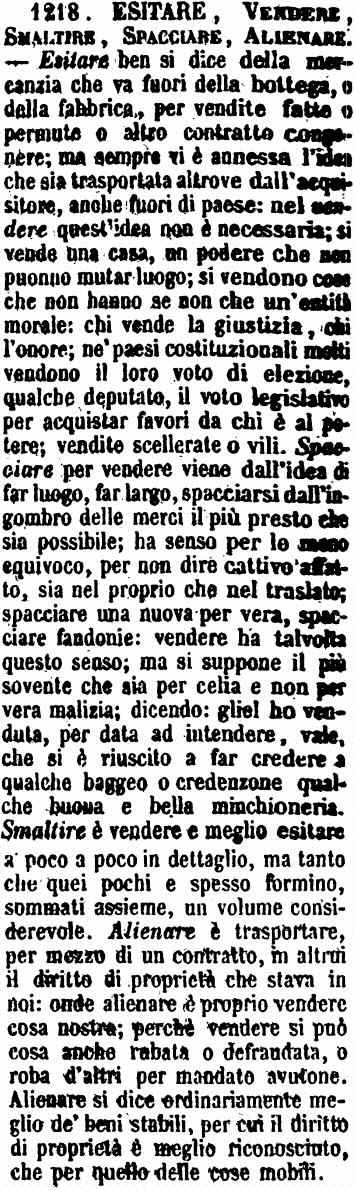 Esitare, Vendere, Smaltire, Spacciare, Alienare - Esitare ben si dice della mercanzia che va fuori della bottega, o della fabbrica, per vendite fatte o permute o altro contratto congenere; ma sempre vi è annessa l'idea che sia trasportata altrove dall'acquisitore, anche fuori di paese: nel vendere quest'idea non è necessaria; si vende una casa, un podere che non puonno mutar luogo; si vendono cose che non hanno se non che un'entità morale: chi vende la giustizia, chi l'onore; ne' paesi costituzionali molti vendono il loro voto di elezione; qualche deputato, il voto legislativo per acquistar favori da chi è al potere; vendite scellerate o vili. Spacciare per vendere viene dall'idea di far luogo, far largo, spacciarsi dall'ingombro delle merci il più presto che sia possibile; ha senso per lo meno equivoco, per non dire cattivo affatto, sia nel proprio che nel traslato; spacciare una nuova per vera, spacciare fandonie: vendere ha talvolta questo senso; ma si suppone il più sovente che sia per celia e non per vera malizia; dicendo: gliel ho venduta, per data ad intendere, vale, che si è riuscito a far credere a qualche baggeo o credenzone qualche buona e bella minchioneria. Smaltire è vendere e meglio esitare a poco a poco in dettaglio, ma tanto che quei pochi e spesso formino, sommati assieme, un volume considerevole. Alienare è trasportare, per mezzo di un contratto, in altrui il diritto di proprietà che stava in noi: onde alienare è proprio vendere cosa nostra; perchè vendere si può cosa anche rubata o defraudata, o roba d'altri per mandato avutone. Alienare si dice ordinariamente meglio de' beni stabili, per cui il diritto di proprietà è meglio riconosciuto, che per quello delle cose mobili. [immagine]