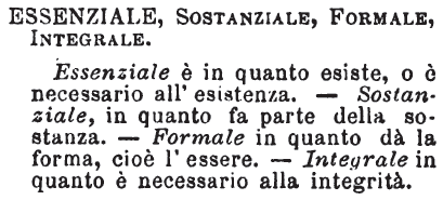 Essenziale, Sostanziale, Formale, Integrale - Essenziale è in quanto esiste, o è necessario all'esistenza. - Sostanziale, in quanto fa parte della sostanza. - Formale in quanto dà la forma, cioè l'essere. - Integrale in quanto è necessario alla integrità. [immagine]